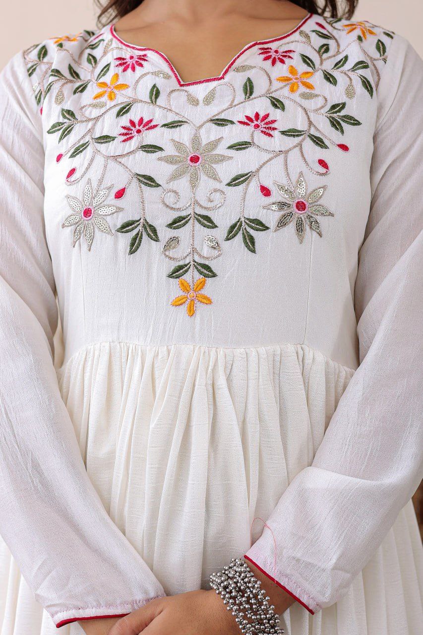 Graceful and festive – this white shimmer Anarkali with vibrant floral Bandhani dupatta is a timeless choice for celebrations, weddings, and festive gatherings.